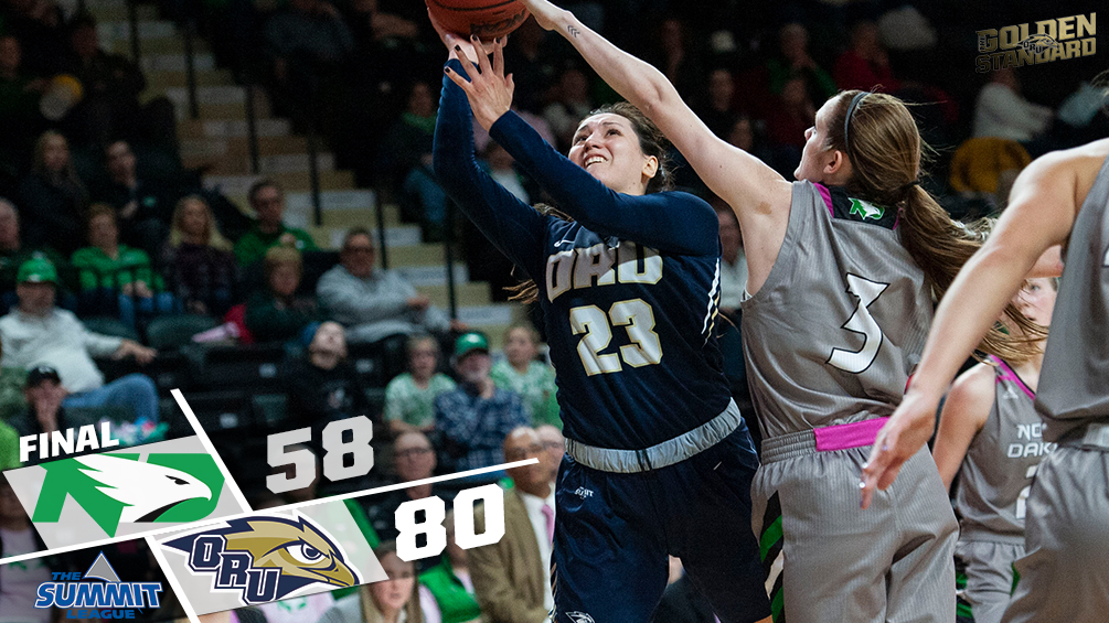 In the second half, Lakota Beatty opened the third quarter going 3-for-3 from three-point range eventually going 5-for-6 in the second half. ORU went up by 20 in the third quarter before North Dakota cut the deficit to 15 to end the third. The Golden Eagles shot 59 percent from the field in the second half. ORU took its largest lead of the game in the fourth quarter by 22 with 5:29 to play. The 22 point lead was regained with 1:09 to go and kept by ORU for the 80-58 advantage.