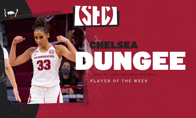 FAYETTEVILLE, Ark. – Redshirt senior guard Chelsea Dungee (Cherokee) earned SEC Player of the Week honors, the conference office announced today. The award is the first weekly recognition for Dungee from the SEC, and she becomes the first Hog to win player of the week honors since Kelsey Brooks was recognized back in December of 2015.