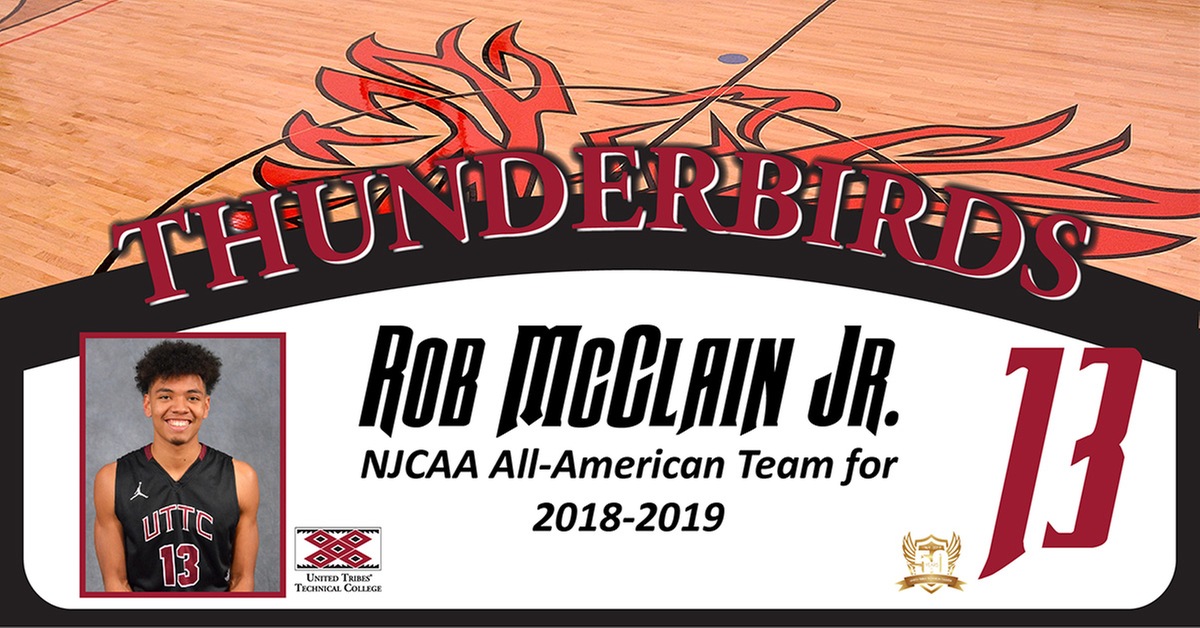 United Tribes Technical College Men’s Basketball Player Rob McClain Jr. was named as an All-American by the National Junior College Athletic Association (NJCAA). The 6’5 forward from Red Lake High School in Red Lake, MN was a sophomore this year for the Thunderbirds. McClain led his team to the Region XIII Championship game by averaging 23.1 points, 11.3 rebounds, 5 assists, 2.3 steals, and 2.2 blocks per game this season. He also had an astonishing 24 double doubles this season and 41 for his career. The versatile McClain led the conference in many statistical categories including rebounding, steals, and blocks. He was also the conferences second leading scorer and finished as the nations 7th leading scorer. He led the nation in field goals made and defensive rebounds and ranked in the top ten in the nation in several statistical categories.